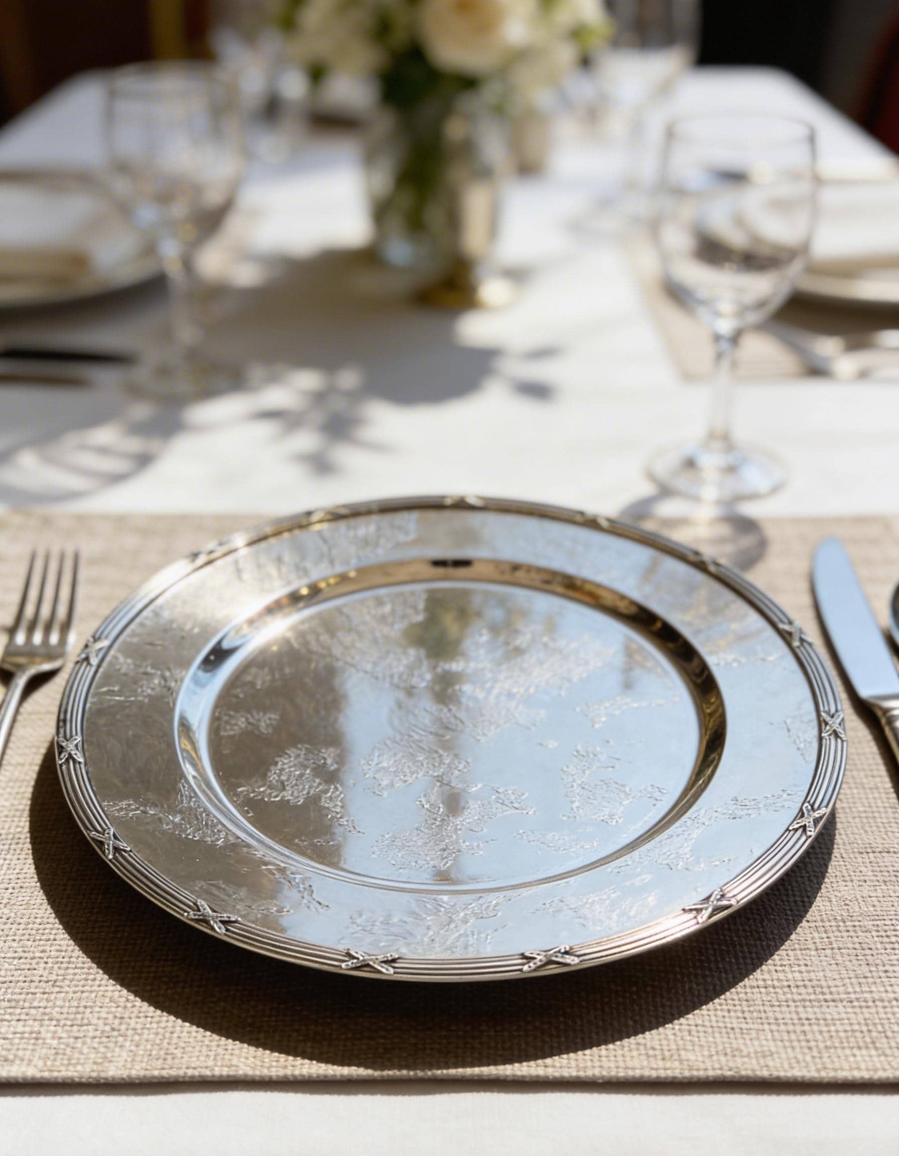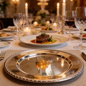 This handmade silver plated brass charger plate charger features a clean circular form with subtle linear edge details. Its understated elegance makes it a perfect choice for those who appreciate modern classic table decor. Designed to blend effortlessly with both contemporary and traditional dining settings, this charger brings a refined and balanced look to your table.