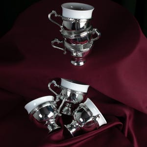 The jug and 6 glasses are made of high quality brass and decorated with lotus flowers. The coating is silver plated.