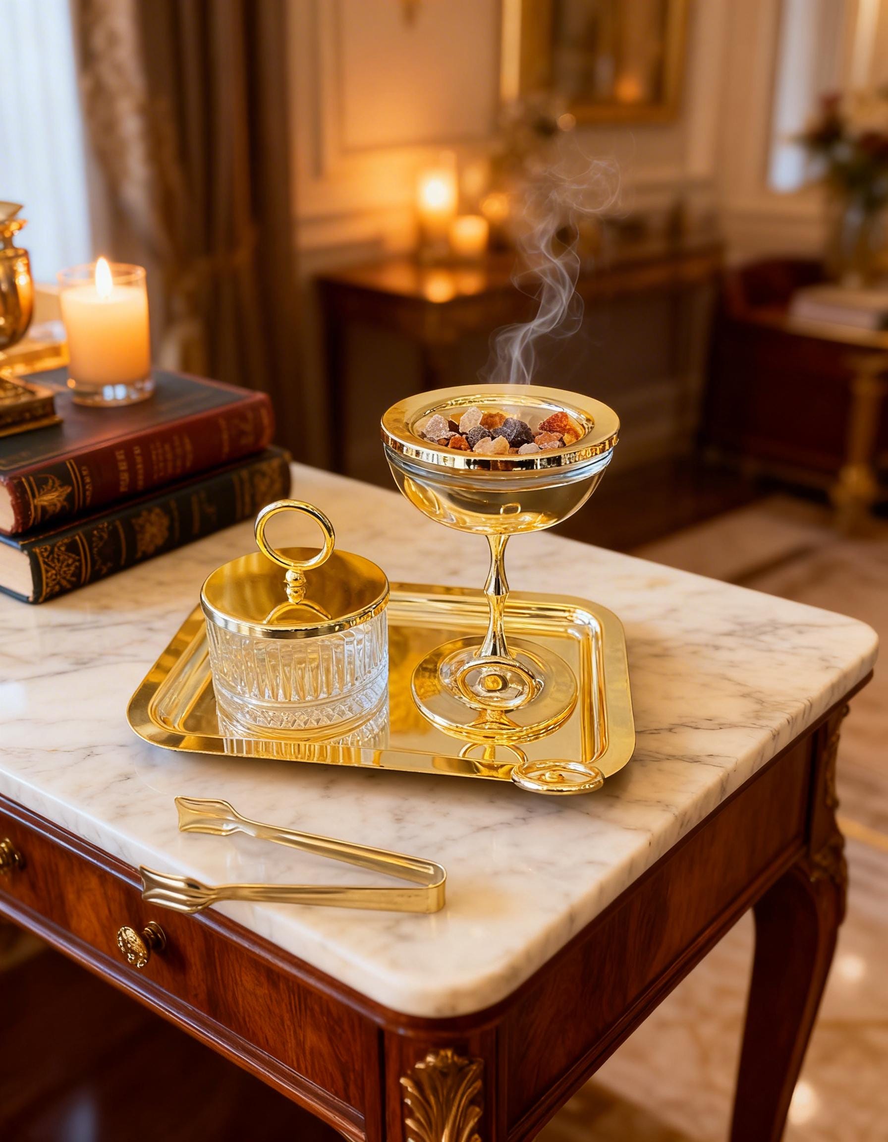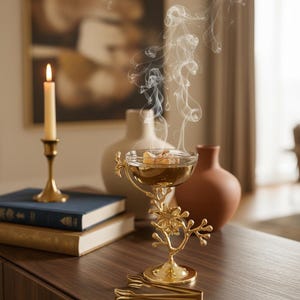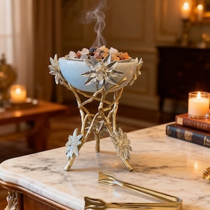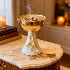 This handmade brass incense holder set combines elegance and functionality in perfect harmony. Each piece is crafted from high-quality solid brass and coated in luxurious gold or silver plating. The set includes a slender-footed incense holder, a lidded bowl with a handle, a matching tray, and tongs — all designed to bring a sense of calm and refinement to your space. Entirely handcrafted, it offers a touch of artisanal beauty that will elevate any room, from your meditation corner to your living room.