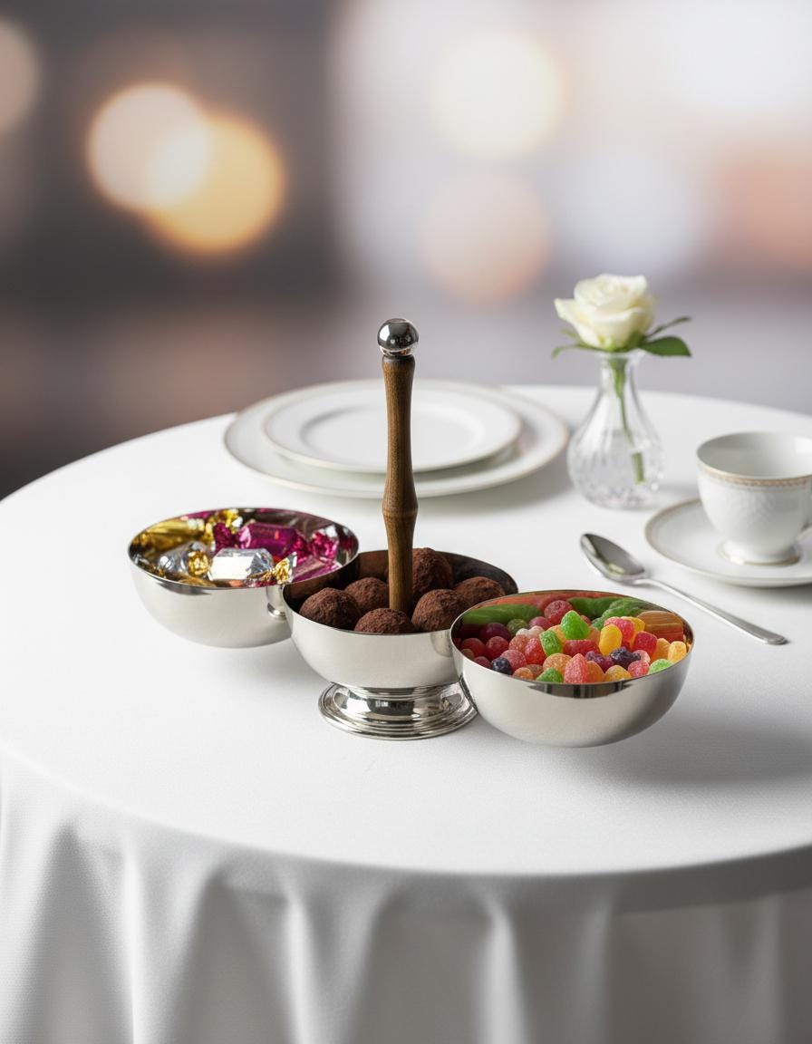 Triple Snack Bowl Brass Silver Serving Stand Wooden Handle