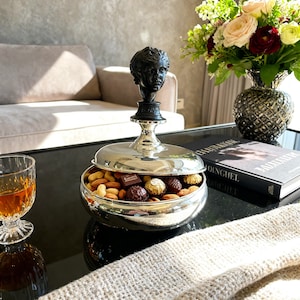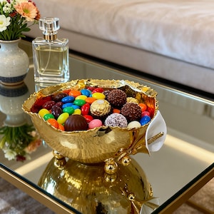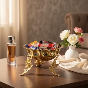 This handmade brass serving bowl set is designed with a unique wooden handle that adds a warm, natural touch to its elegant silver-plated structure. The trio of bowls rests on a solid brass base, ideal for serving nuts, cookies, appetizers, or small desserts. Each piece is carefully crafted by artisans, blending timeless metalwork with the beauty of natural wood. Perfect for those who appreciate both sophistication and craftsmanship at the table.