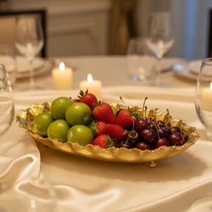 This handcrafted oval fruit bowl is made of solid brass, shaped and textured by hand with traditional hammer strokes. Every detail — from its curved form to its shimmering edges — is the result of patient, artisan work. Available in gold and silver finishes, it adds timeless sophistication to any table setting.