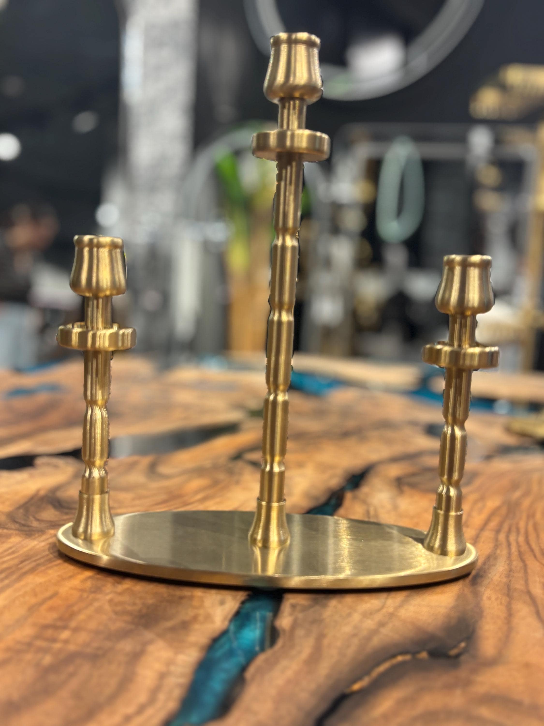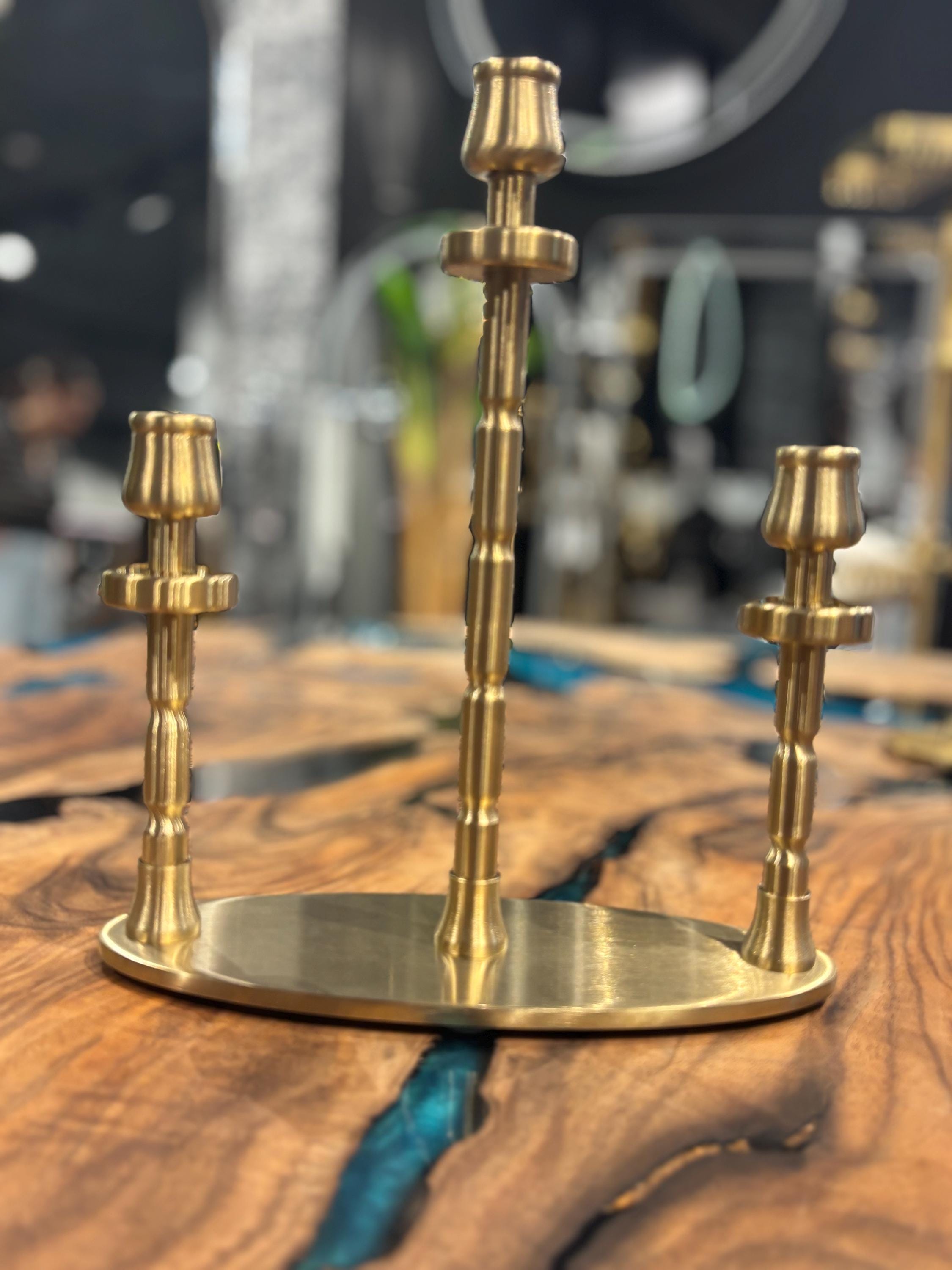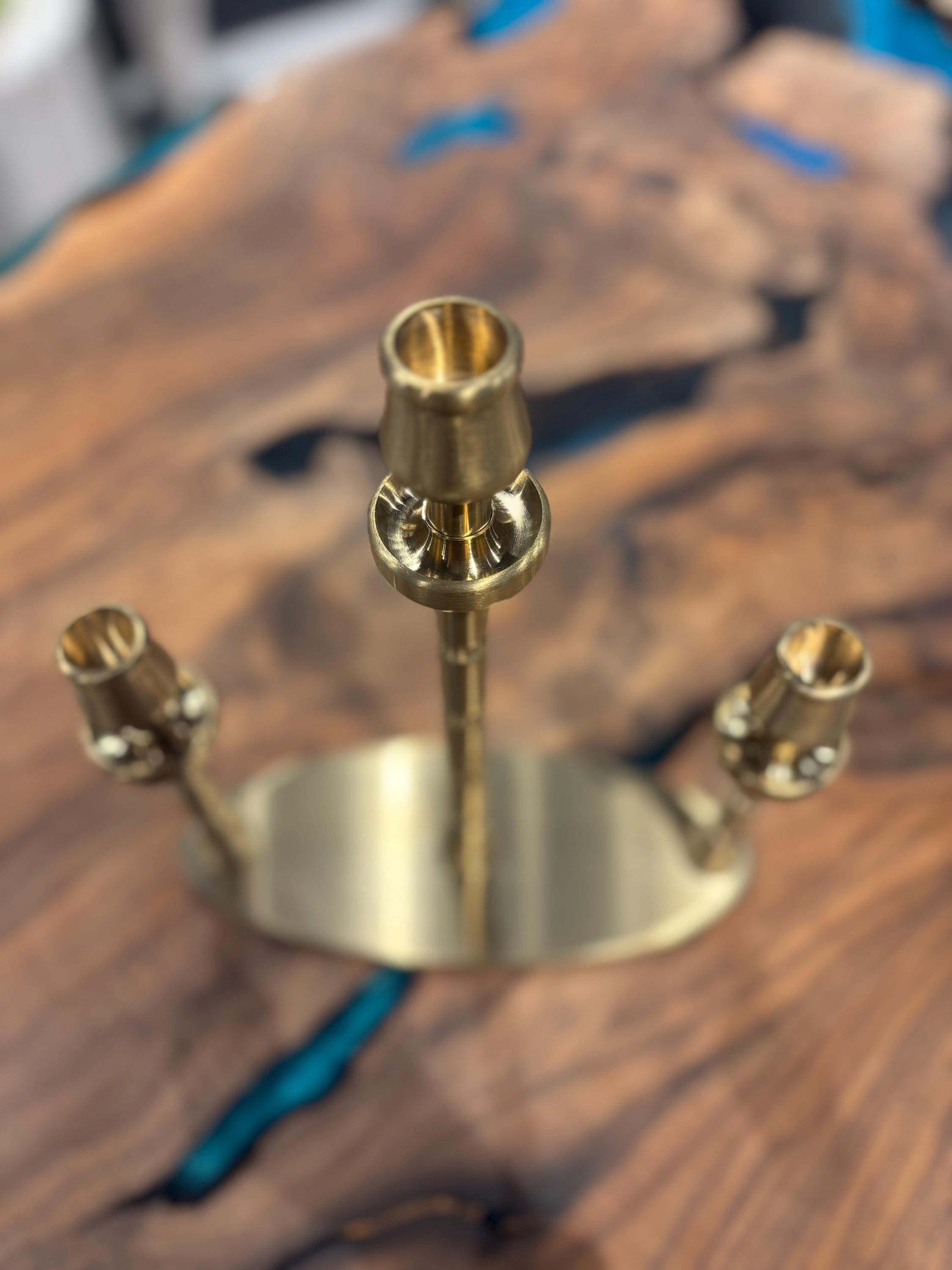 This elegant three-arm brass candle holder is completely handcrafted from solid brass with a refined matte gold finish. Each stem is designed with intricate, symmetrical details, creating a timeless centerpiece for your table or console.