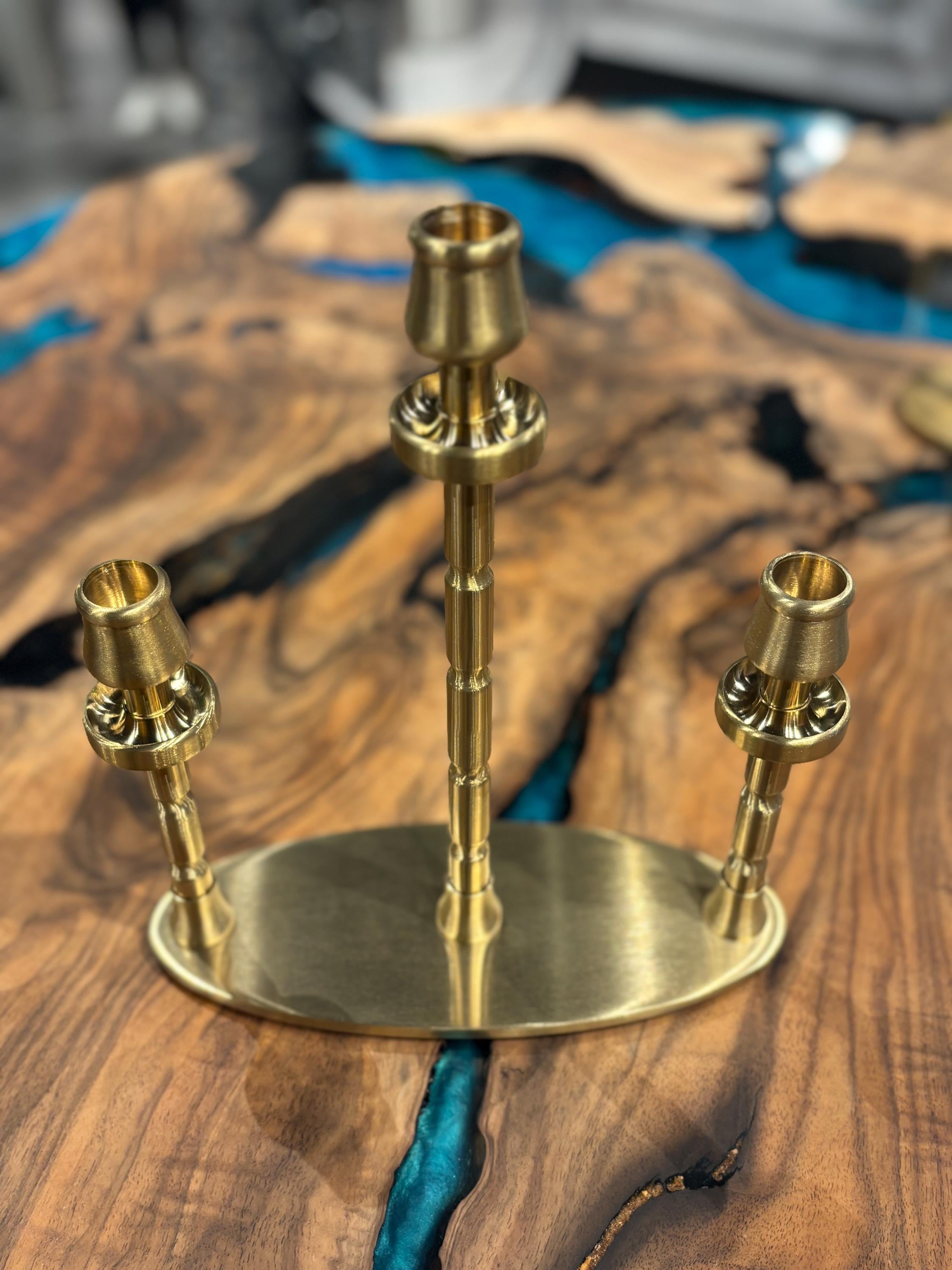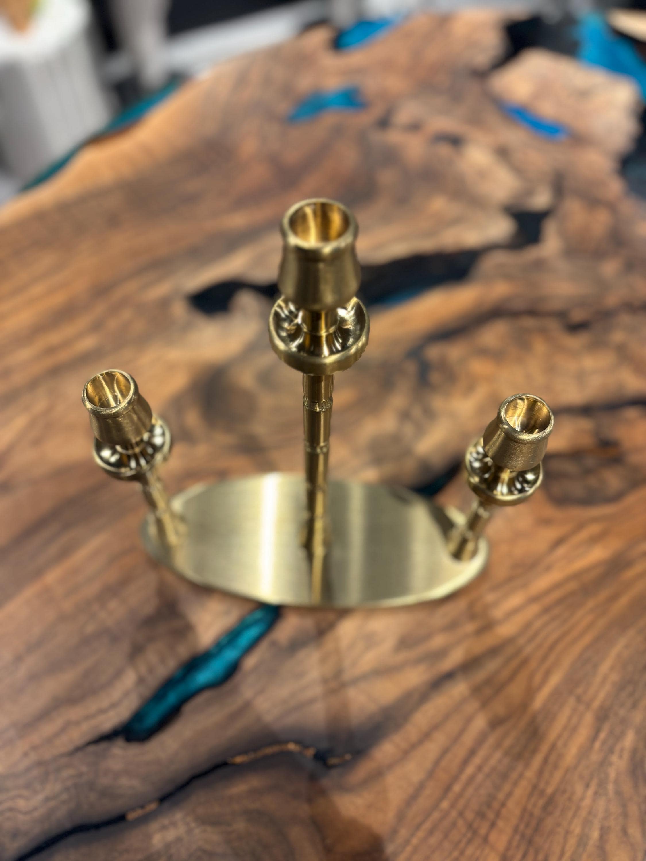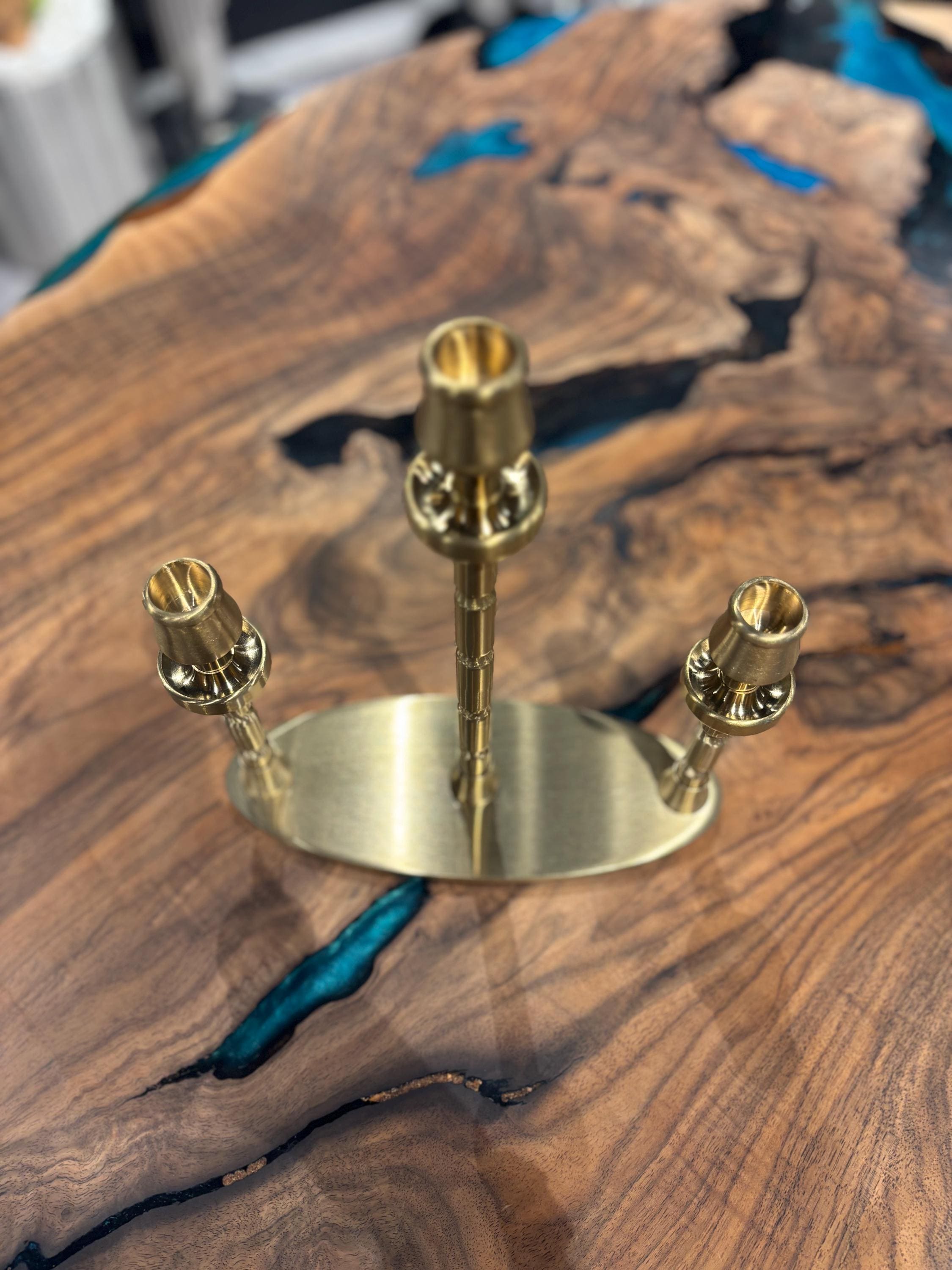 This elegant three-arm brass candle holder is completely handcrafted from solid brass with a refined matte gold finish. Each stem is designed with intricate, symmetrical details, creating a timeless centerpiece for your table or console.
