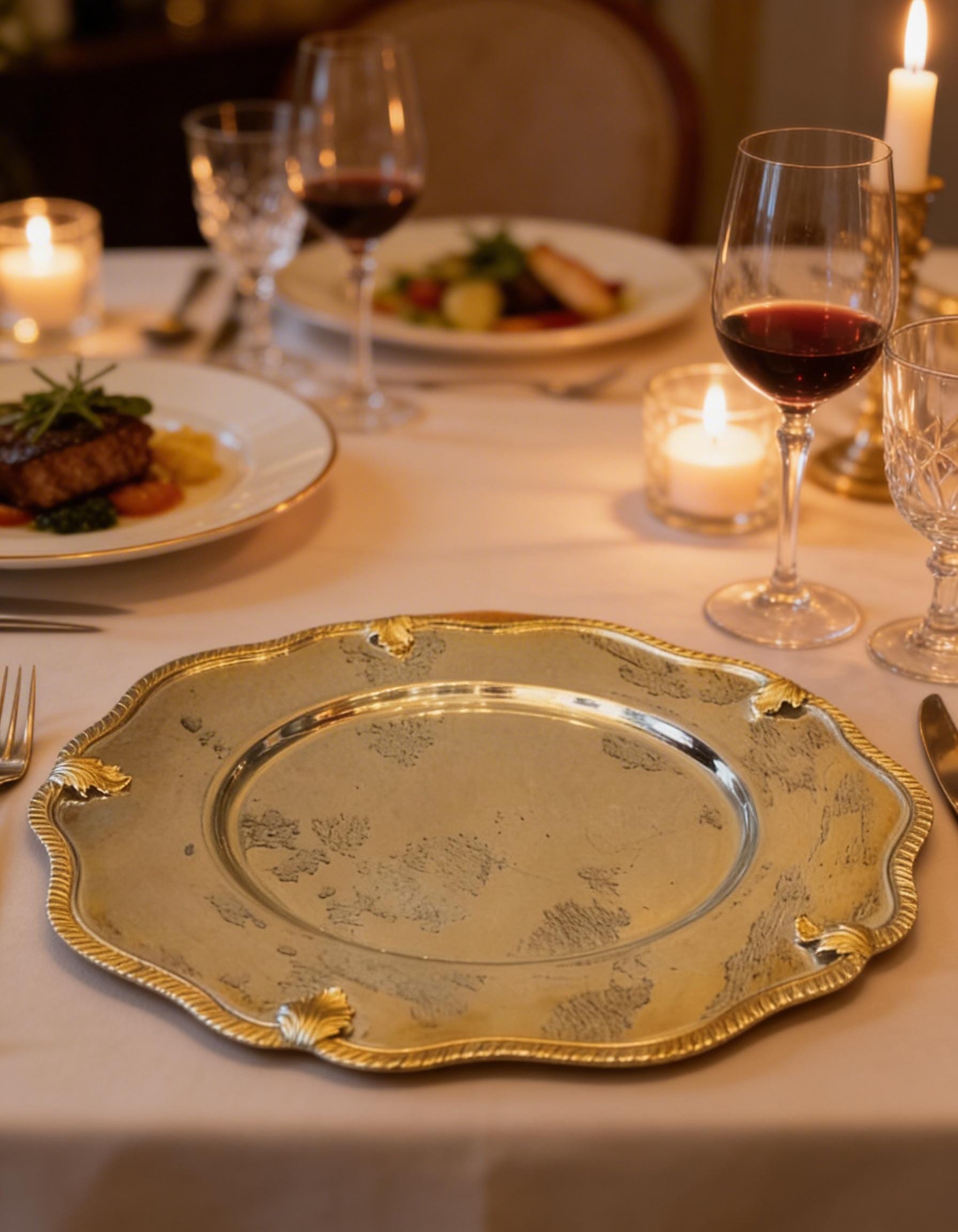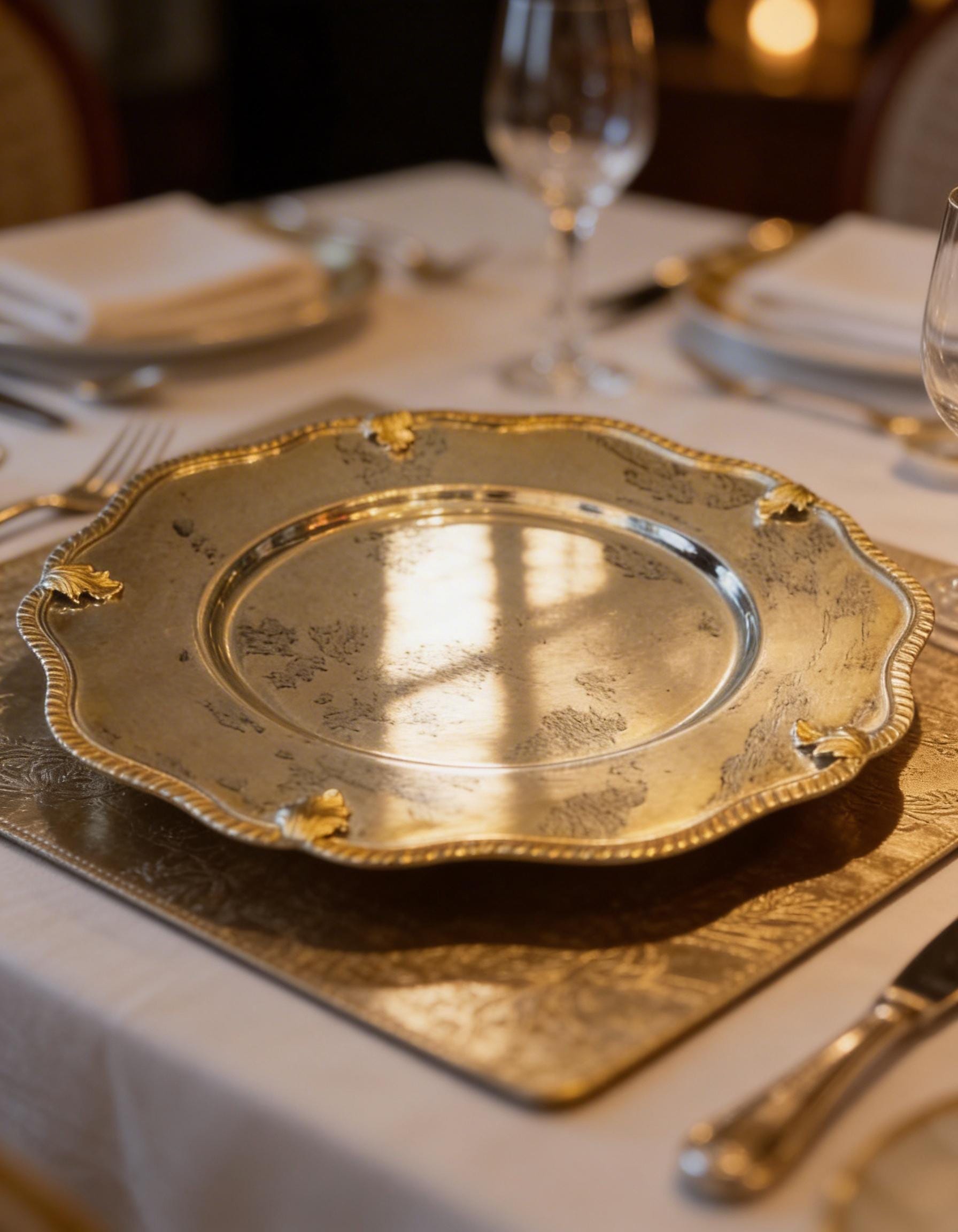 This handmade charger plate is crafted from solid brass and finished with premium gold or silver plating. Each piece is shaped and polished by artisans to elevate your dining table with an elegant, timeless touch. Its ornate edge design adds a luxurious visual highlight suitable for both daily use and special gatherings.