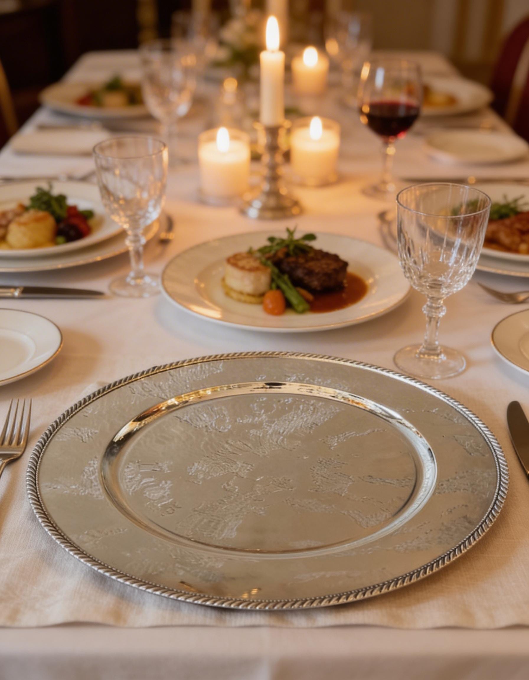 This handmade textured charger plate adds instant elegance to any dining table. Crafted from solid brass and finished with a refined silver plated surface, it creates a luxurious base for your dinner plates and enhances the beauty of your table setting. A timeless piece that impresses guests and elevates every meal.