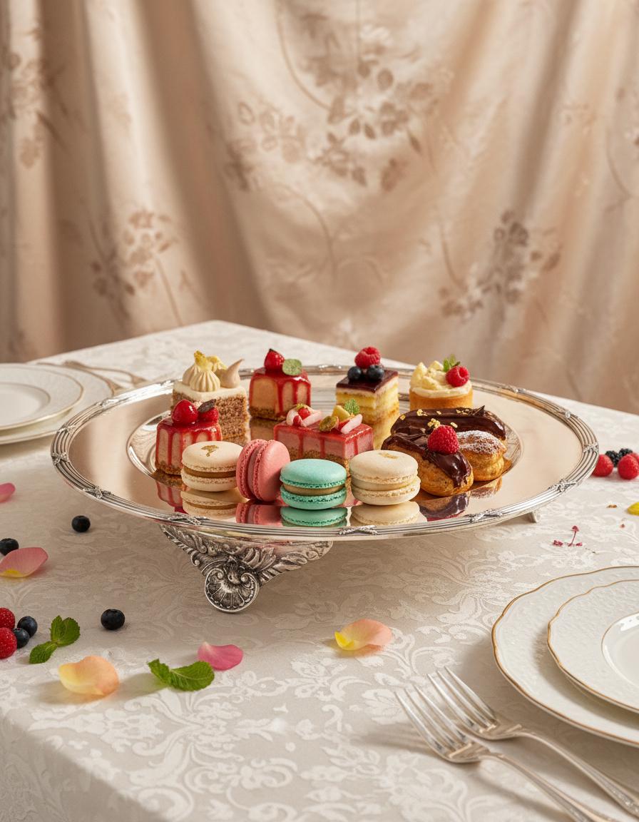 This beautifully handcrafted footed wedding cake stand is made from solid brass and finished with a radiant silver or gold plated coating. Its ornate legs and delicately detailed rim create a luxurious presentation piece for any celebration. From wedding cakes to festive desserts, it brings timeless elegance to every table.