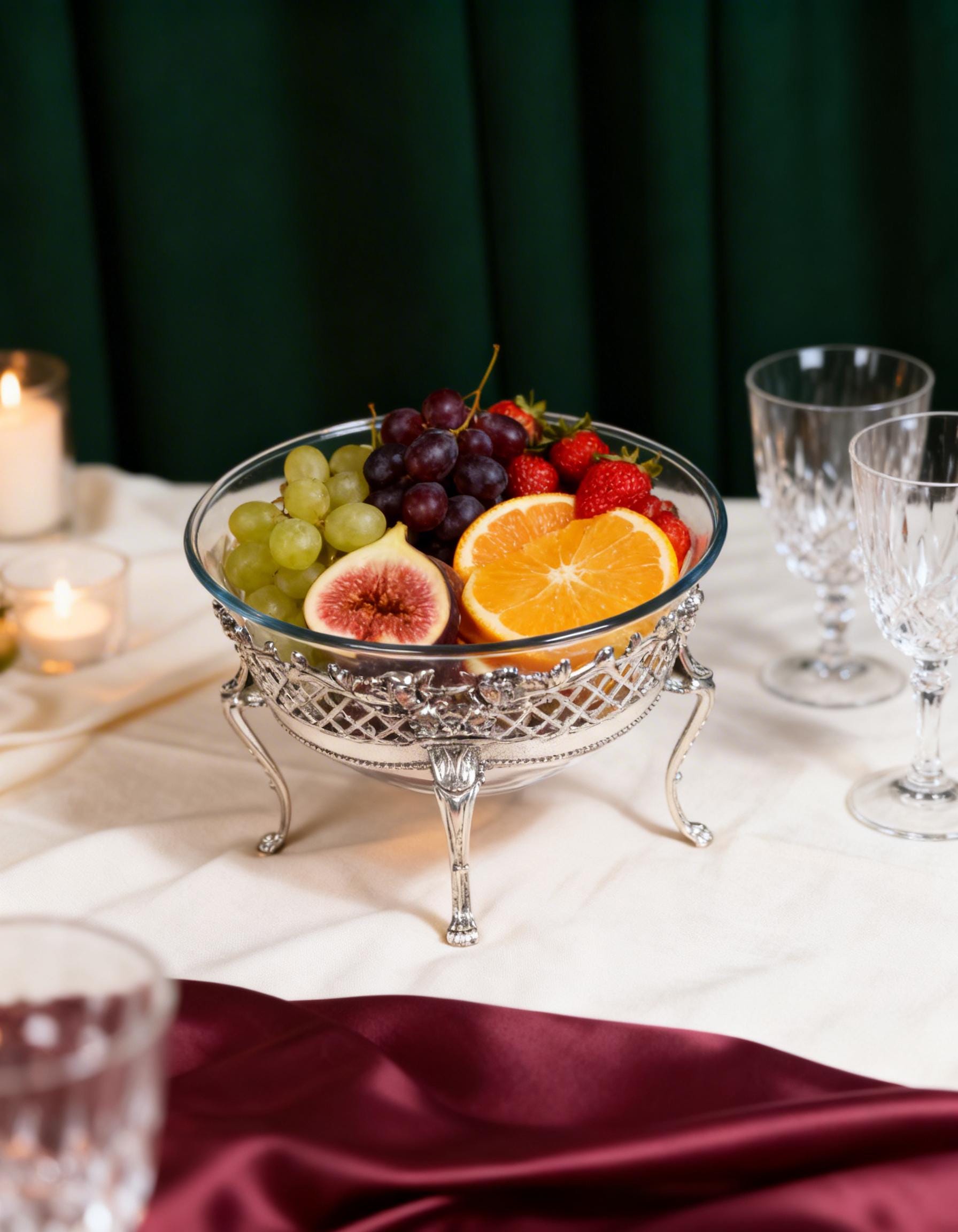 This handmade pedestal silver serving bowl is crafted from solid brass using traditional metalworking techniques and finished with a refined silver plating. The elegant footed design combined with a clear glass bowl creates a luxurious presentation for both everyday dining and special occasions. Each piece is individually handmade, giving it a unique artisanal character and timeless decorative appeal.