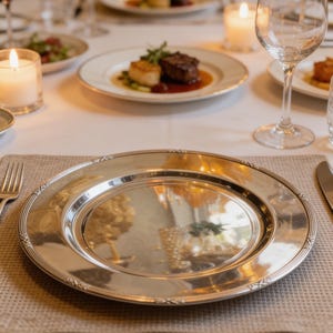 This handmade brass cake stand silver plated brass dinner plate charger is designed with a clean, smooth rim and a subtly sculpted raised base. Its understated form highlights timeless craftsmanship without excessive ornamentation. Created for those who appreciate classic design with a minimalist approach, this charger brings quiet elegance to refined table settings.